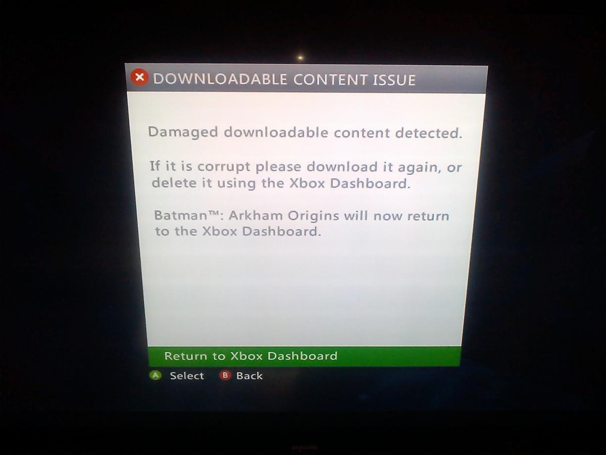 Hey, I've started playing Batman Arkham Origins 30 minutes ago, after downloading and burning it into a disc. I've reached the level where we go to the Batcave for the first time, but when we need to fasttravel to Penguin's location, the game freezes and shows an error which says : "DOWNLOADABLE CONTENT ISSUE - Damaged downloadable content detected." Please tell me how to solve this problem? Been waiting to play this game from a very long time. Thanks. Error's photo : http://imageshack.us/a/img689/5283/53g9.jpg