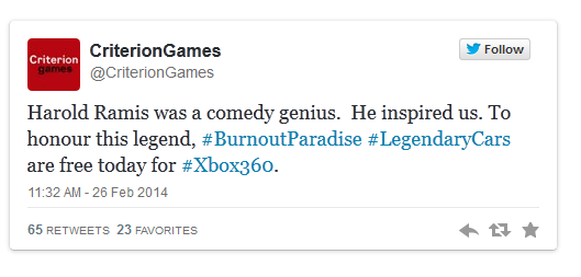 Burnout Paradise has honoured the memory of Harold Ramis with a free car pack. For today (February 26) only, Xbox 360 users can download the Legendary Car Pack for free from the Xbox Marketplace. The Legendary Car Pack contains a reworked Hunter Manhattan Spirit made up to look like the Ecto 1 in Ghostsbusters. The car pack also contains the Jansen 88 Special, Hunter Cavalry Bootlegger and the Carson GT Nighthawk. http://www.youtube.com/watch?feature=player_embedded&v=i4hB0t3YNoE Harold Ramis passed away on Monday (February 24) aged 69. He was best known for his starring role as Egon Spengler in 1984's supernatural comedy Ghostbusters and its 1989 sequel, both of which he wrote with his co-star Dan Aykroyd. Source Digital Spy.