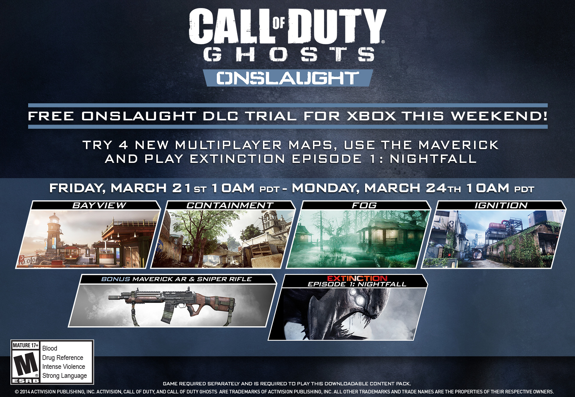Your weekend plans are covered, Xbox LIVE users, as we're launching the Call of Duty®: Ghosts Onslaught DLC Trial Weekend! From Friday, March 21st (10am/PDT) until Monday, March 24th (10am/PDT), players on both the Xbox One and Xbox 360 can download the trial DLC and try out the Onslaught DLC Pack at no cost. This includes battling on four new small to medium Multiplayer maps, trying out the dual-purpose Maverick weapon, and experiencing the first installment in the Extinction four-part episodic narrative, Episode 1: Nightfall. Call of Duty®: Ghosts Onslaught is available now on Xbox, Playstation and PC Source Cod Forums