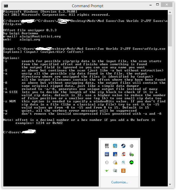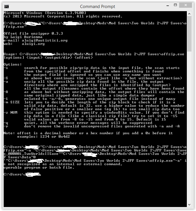 I've been trying to run Offzip to get the right file to edit my Two Worlds 2 save but I can not get Offzip to work, I have used the tutorials but none of them help. Can anyone help me get this working. First image is when I first load up Offzip Second image is when I follow the tutorial