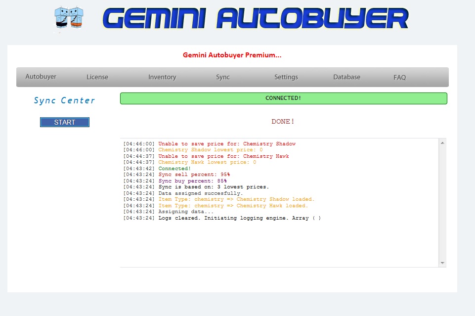 Autobuyers Update Hey, boys and girls, i've managed to finish the 2.4 update before the scheudled time. So, it might be that sunday should come up with another set of consumables in our autobuyer. This is an experimental engine we are testing, therefore, the file sizes are 50% lower (~12MB) unlike the old ~23MB. The new engine should prived a smooth experience with the autobuyer, making the software run without any freeze-screen, and without any errors. I've made some change logs: Gemini Autobuyer Standard: Implemented the new search functions. Search cap updated from 10 to 16. New loading screen added. Fixed listing/relisting. Fixed inventory update* and more bugs. Removed messages from buy, list and relist. Added wake-up messages every 9 minutes. * = You don't have to restart the autobuyer after you have made inventory changes Gemini Autobuyer Premium: Implemented the new search functions. Search cap updated from 16 to 50. New loading screen added. Fixed listing/relisting. Fixed sync, inventory update* and more bugs. Removed messages from buy, list and relist. Added wake-up messages every 9 minutes. * = You don't have to restart the autobuyer after you have made inventory changes General Software engine: Runs smooth, no freeze, no crash. Fixed database search crash error (player database search). There might be some memory errors, please report them as soon as you get them (i know the problems and i will fix them asap) Memory leak was fixed. Less CPU usage. Less network usage. So, hopefully, there will be more updates with the consumables by sunday. Cheers and have a nice day.