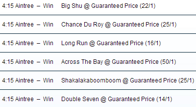 was looking at that chance du roy will probs places, there again nothing is guaranteed in this race. i'm guessing 30+ will fall/get pulled up