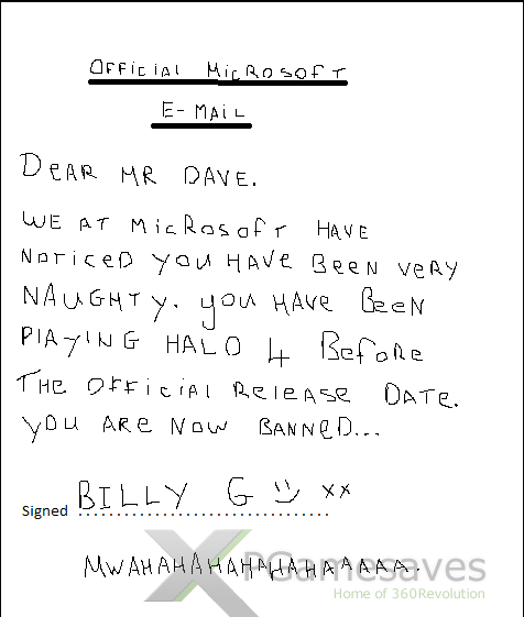 Been playing Halo 4 since yesterday. Really didn't think this was going to happen but as I was playing it just now got kicked offline! When I tried to sign back in my account and xbox were both banned. I went and checked my e-mails and it does clearly state I was banned for playing Halo 4... E-mail I recieved from Microsoft is below! E-mail Spoiler