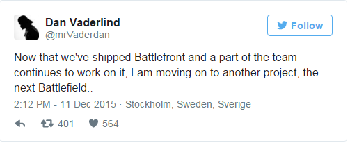 Development director at DICE confirms he’s moving on to a new project. DICE has confirmed that development of the next Battlefield game is well underway. After shipping Star Wars Battlefront this year, development director Dan Vanderlind has now moved on to his next big project. What the “next Battlefield” is we don’t yet know. We do know a Battlefield game is confirmed for 2016. It could be Battlefield 5, or it could be another spin-off like Battlefield Hardline. I know which one I’d like to see, what about you?