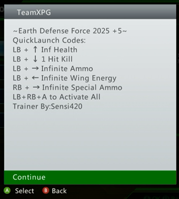 File Name: {Trainer} Earth Defense Force 2025 +5 ALL TU File Submitter: Sensi420 File Submitted: 16 Feb 2014 File Category: XBOX 360 Trainers Title ID : 44500805 TU Required: No DLC required ?: No Smoked BY XPGSensi420 ~Options~ Inf Health 1 Shot Kills Infinite Ammo Infinite Special Ammo Infinite Wing Energy ~Instructions~ 1. Download The Attachment Below 2. Extract. 3. Put "Trainer.xex" And "Trainer_Loader.xex" On Your HDD 4. Run The Trainer_Loader.xex 5. Now Run the Game. Press Back + Dpad UP To Bring Up The Trainer. 6. Enjoy! ~Notes~ Made for Title ID: 44500805 Title Update Needed: ANY TU ~TeamXPG Sr~ - ADDZ - XPGObyto- Bullet -- BxRKings - begallegal1 - XPGSensi420 - GoldZ - AlexKyori -f1l3gr3n- -TeamXPG Dev- Whit ey -redhulk- JohnAKAGoldGiver-MastaOfEvil - -- XPGAurora -t3fury -losparo-XPGRocky-AAW- Froody UnHidden Content: Click here to download this file