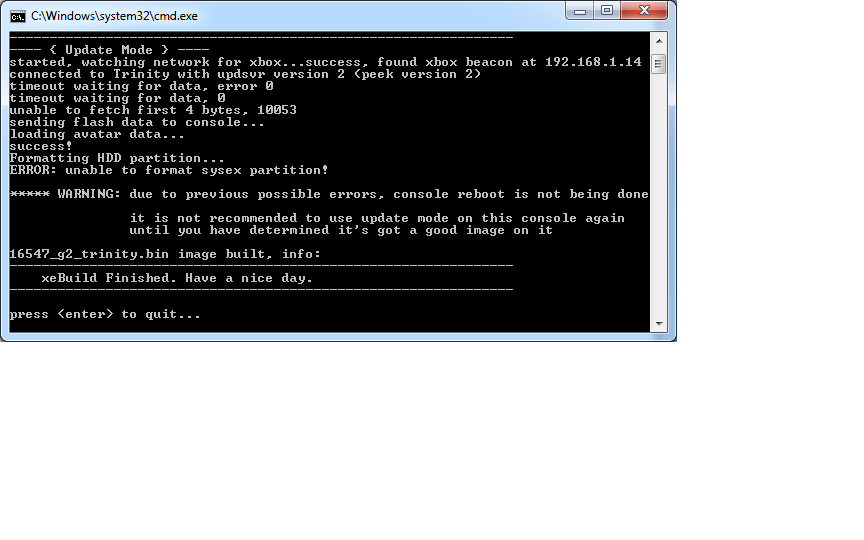 C:\Update>xebuild update -f 16547 --------------------------------------------------------------- xeBuild v1.11.647 --------------------------------------------------------------- ---- { Update Mode } ---- started, watching network for xbox...UDP wait timeout! failed to find xbox beacon ***** FATAL UPDATE ERROR: unable to find console! --------------------------------------------------------------- xeBuild Finished. Have a nice day. --------------------------------------------------------------- For those getting this error. Move default.xex for dashlaunch to root of your consoles HDD into the installer folder ex: HDD1:/installer and run it from there. this solved my problem with this issue