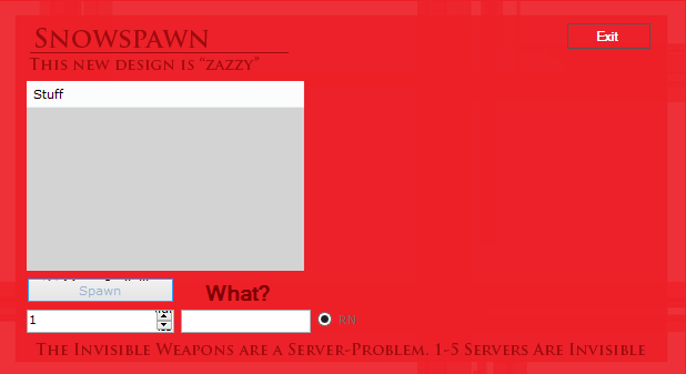Hey guys i made this as my first ever hacking project on pc! it wasn't too difficult but it took a lot of time, i am VERY happy to negotiate price The spawner will not let you spawn in items until you are in the game! This is also partially infistarr bypassed but most wepons infistarr will take... It is still a bit glitchy but ive used it on atleast 15 servers either with an AH bypass or infistarr and i've been happy with it! Heres a screen cap of the app itself! ( Cannot be bothered to load up arma 2 atm..) WIll also post a cap of source (But it is easily reflected so you can check for a key stealer if you would like!) Send me a message with any enquiries!