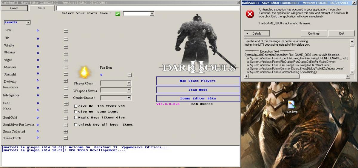 Hello to everyone and thanks in advance to everyone which will eventually answer to me: I open this topic to find some help about the unhandled exception error occurring when trying to use Dark Souls 2 Editor on Windows XP (Service Pack 2 installed, Net Framework 4.0 v30319 installed). Here is the trouble: once launched the Editor executable the program opens smoothly but as soon as I click on the LOAD button the arror appears and I can only quit or continue: if I continue, the editor simply remains open but I have no possibility to open any savegame file; if I click again on LOAD button the error appears again and the loop restarts (I cannot even open a savegame, the editor halts without giving me the possibility to open the savegame file as soon as I click on the LOAD button). I tried both the two versions of Editor I found (13b and 13c) and here below I post the full text of the error for both the versions: Ver. 13b See the end of this message for details on invoking just-in-time (JIT) debugging instead of this dialog box. ************** Exception Text ************** System.InvalidOperationException: File |-GAME_0000 is not a valid file name. at System.Windows.Forms.OpenFileDialog.RunFileDialog(OPENFILENAME_I ofn) at System.Windows.Forms.FileDialog.RunDialogOld(IntPtr hWndOwner) at System.Windows.Forms.FileDialog.RunDialog(IntPtr hWndOwner) at System.Windows.Forms.CommonDialog.ShowDialog(IWin32Window owner) at System.Windows.Forms.CommonDialog.ShowDialog() at Darksoul2.Form1.IshYJjaza52qTKpTWGN(Object ) at Darksoul2.Form1.pGvGvOkoPB(Object , EventArgs ) at System.Windows.Forms.Control.OnClick(EventArgs e) at System.Windows.Forms.Button.OnClick(EventArgs e) at System.Windows.Forms.Button.OnMouseUp(MouseEventArgs mevent) at System.Windows.Forms.Control.WmMouseUp(Message& m, MouseButtons button, Int32 clicks) at System.Windows.Forms.Control.WndProc(Message& m) at System.Windows.Forms.ButtonBase.WndProc(Message& m) at System.Windows.Forms.Button.WndProc(Message& m) at System.Windows.Forms.Control.ControlNativeWindow.OnMessage(Message& m) at System.Windows.Forms.Control.ControlNativeWindow.WndProc(Message& m) at System.Windows.Forms.NativeWindow.Callback(IntPtr hWnd, Int32 msg, IntPtr wparam, IntPtr lparam) ************** Loaded Assemblies ************** mscorlib Assembly Version: 4.0.0.0 Win32 Version: 4.0.30319.1 (RTMRel.030319-0100) CodeBase: file:///C:/WINDOWS/Microsoft.NET/Framework/v4.0.30319/mscorlib.dll ---------------------------------------- Darksoul2 Assembly Version: 1.0.0.0 Win32 Version: 1.0.0.0 CodeBase: file:///C:/Documents%20and%20Settings/User/Desktop/13b/Darksoul2.exe ---------------------------------------- System Assembly Version: 4.0.0.0 Win32 Version: 4.0.30319.1 built by: RTMRel CodeBase: file:///C:/WINDOWS/Microsoft.Net/assembly/GAC_MSIL/System/v4.0_4.0.0.0__b77a5c561934e089/System.dll ---------------------------------------- System.Windows.Forms Assembly Version: 4.0.0.0 Win32 Version: 4.0.30319.1 built by: RTMRel CodeBase: file:///C:/WINDOWS/Microsoft.Net/assembly/GAC_MSIL/System.Windows.Forms/v4.0_4.0.0.0__b77a5c561934e089/System.Windows.Forms.dll ---------------------------------------- System.Drawing Assembly Version: 4.0.0.0 Win32 Version: 4.0.30319.1 built by: RTMRel CodeBase: file:///C:/WINDOWS/Microsoft.Net/assembly/GAC_MSIL/System.Drawing/v4.0_4.0.0.0__b03f5f7f11d50a3a/System.Drawing.dll ---------------------------------------- System.Core Assembly Version: 4.0.0.0 Win32 Version: 4.0.30319.1 built by: RTMRel CodeBase: file:///C:/WINDOWS/Microsoft.Net/assembly/GAC_MSIL/System.Core/v4.0_4.0.0.0__b77a5c561934e089/System.Core.dll ---------------------------------------- d2f63c47-68cf-4522-b4f9-9bbc0d4fe781 Assembly Version: 1.0.0.0 Win32 Version: 1.0.0.0 CodeBase: file:///C:/Documents%20and%20Settings/User/Desktop/13b/Darksoul2.exe ---------------------------------------- System.Xml Assembly Version: 4.0.0.0 Win32 Version: 4.0.30319.1 built by: RTMRel CodeBase: file:///C:/WINDOWS/Microsoft.Net/assembly/GAC_MSIL/System.Xml/v4.0_4.0.0.0__b77a5c561934e089/System.Xml.dll ---------------------------------------- ************** JIT Debugging ************** To enable just-in-time (JIT) debugging, the .config file for this application or computer (machine.config) must have the jitDebugging value set in the system.windows.forms section. The application must also be compiled with debugging enabled. For example: <configuration> <system.windows.forms jitDebugging="true" /> </configuration> When JIT debugging is enabled, any unhandled exception will be sent to the JIT debugger registered on the computer rather than be handled by this dialog box. Ver. 13c See the end of this message for details on invoking just-in-time (JIT) debugging instead of this dialog box. ************** Exception Text ************** System.InvalidOperationException: File |-GAME_0000 is not a valid file name. at System.Windows.Forms.OpenFileDialog.RunFileDialog(OPENFILENAME_I ofn) at System.Windows.Forms.FileDialog.RunDialogOld(IntPtr hWndOwner) at System.Windows.Forms.FileDialog.RunDialog(IntPtr hWndOwner) at System.Windows.Forms.CommonDialog.ShowDialog(IWin32Window owner) at System.Windows.Forms.CommonDialog.ShowDialog() at Darksoul2.Form1.hv9UUmez4e2lvlRJ7U5(Object ) at Darksoul2.Form1.button1_Click(Object sender, EventArgs e) at System.Windows.Forms.Control.OnClick(EventArgs e) at System.Windows.Forms.Button.OnClick(EventArgs e) at System.Windows.Forms.Button.OnMouseUp(MouseEventArgs mevent) at System.Windows.Forms.Control.WmMouseUp(Message& m, MouseButtons button, Int32 clicks) at System.Windows.Forms.Control.WndProc(Message& m) at System.Windows.Forms.ButtonBase.WndProc(Message& m) at System.Windows.Forms.Button.WndProc(Message& m) at System.Windows.Forms.Control.ControlNativeWindow.OnMessage(Message& m) at System.Windows.Forms.Control.ControlNativeWindow.WndProc(Message& m) at System.Windows.Forms.NativeWindow.Callback(IntPtr hWnd, Int32 msg, IntPtr wparam, IntPtr lparam) ************** Loaded